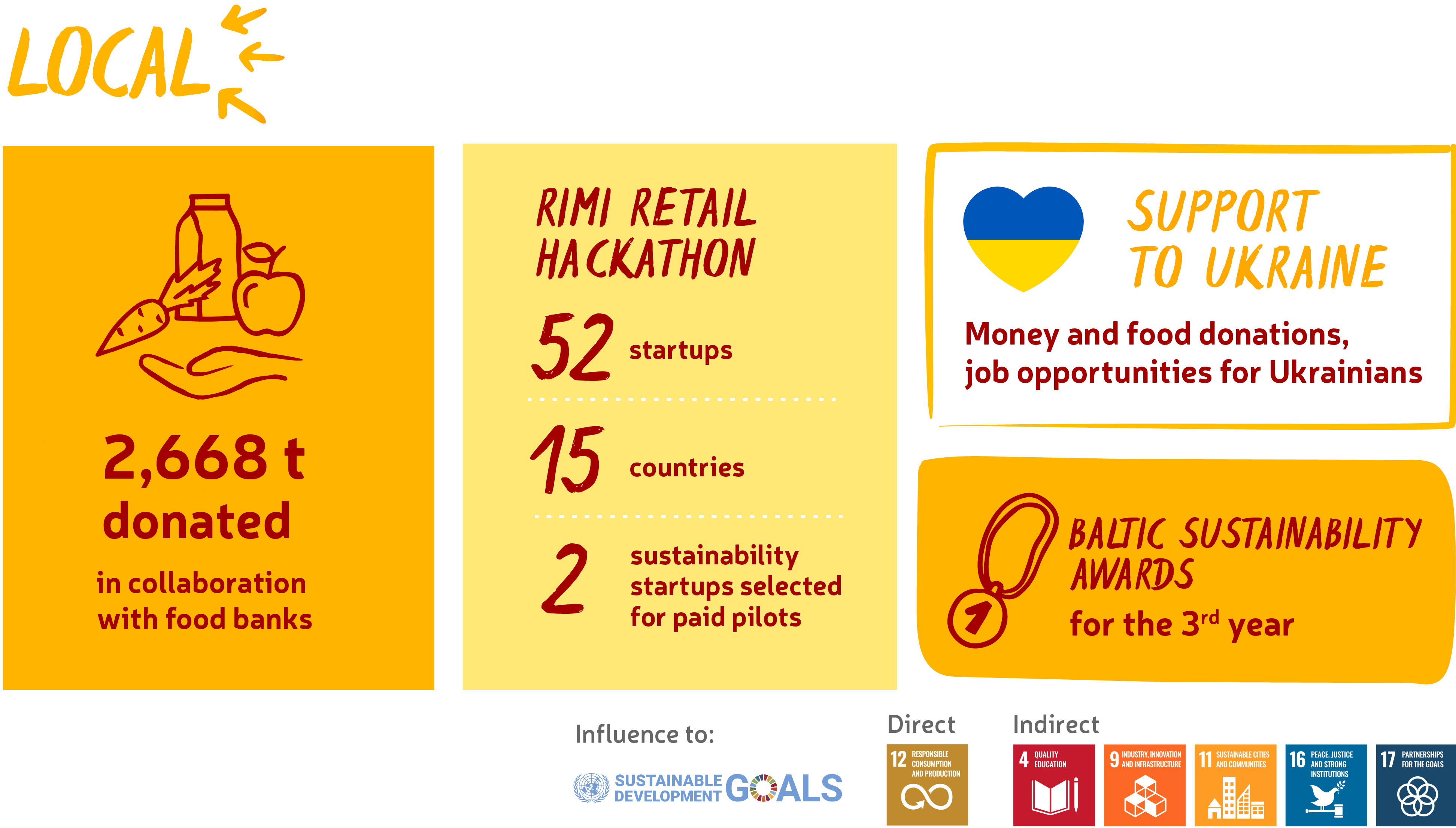 Rimi and ICA Gruppen hold a position of responsibility both in the supply chain, as well as in the societies it works in. From the field and production, all the way to when the product has reached the clients’ homes, sustainability and corporate social responsibility remain a priority. See our milestones of Rimi’s work on sustainability across the Baltic in 2023 according to five focus areas: locality, environment, health, diversity, and quality.